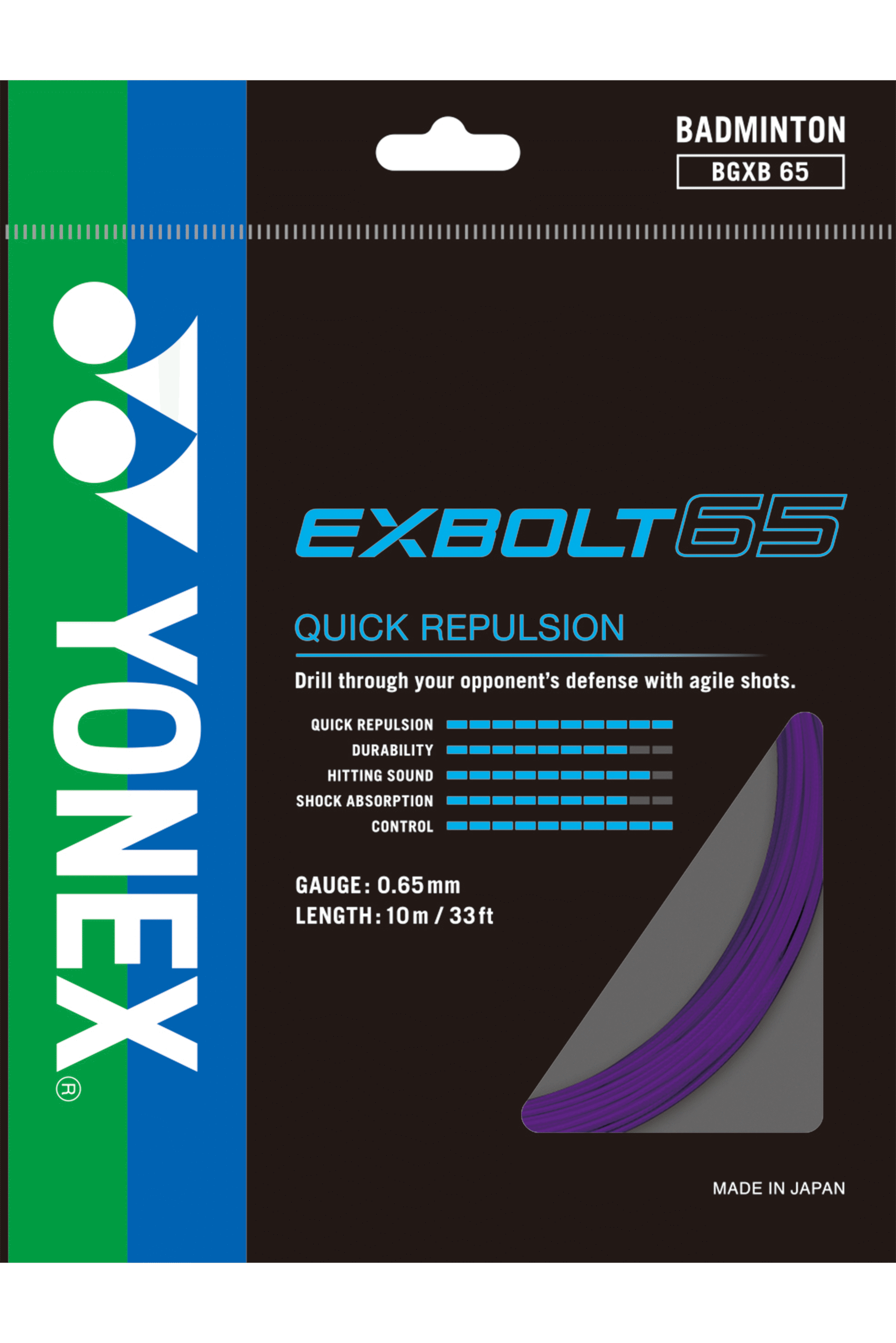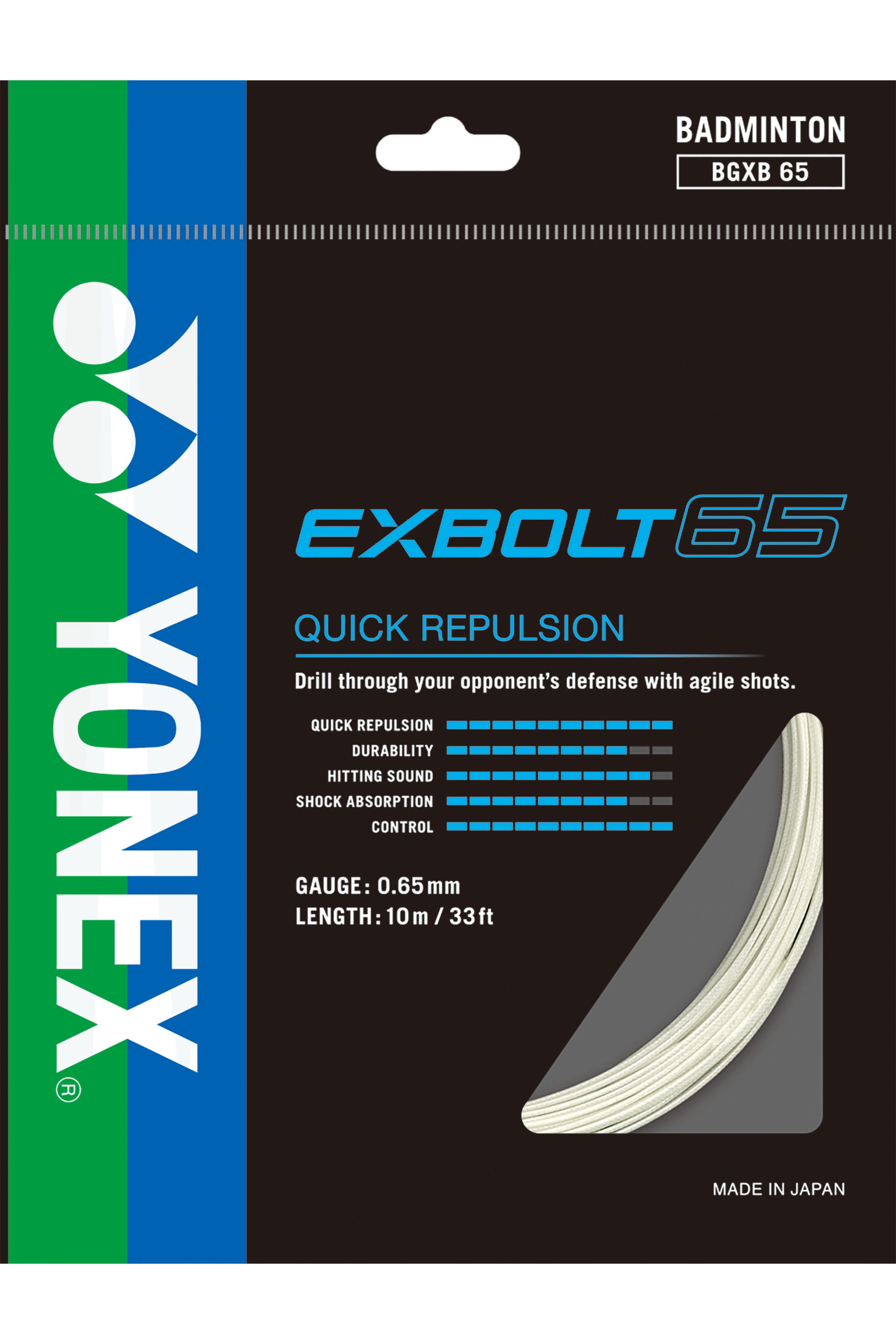 The Yonex BG Exbolt 65 is a popular badminton string known for its excellent blend of quick repulsion, control, and durability. Its key features stem from innovative material technology developed by Yonex.